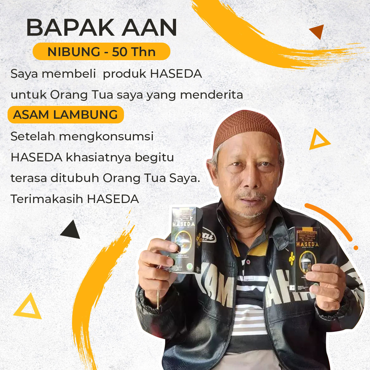 Singkut - Saya membeli produk HASEDA untuk Orang Tua saya yang menderita PENYAKIT PARU-PARU, setelah mengkonsumsi HASEDA khasiatnya begitu terasa ditubuh Orang Tua Saya. Terimakasih HASEDA.